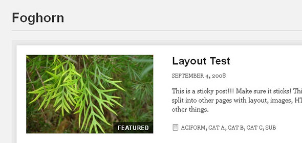 Foghorn — минималистичная тема WordPress. Имеет настраиваемую панель вариантов переключения макетов, удаляются боковые панели, доступна загрузка логотипа, а также изменение текста подвала.