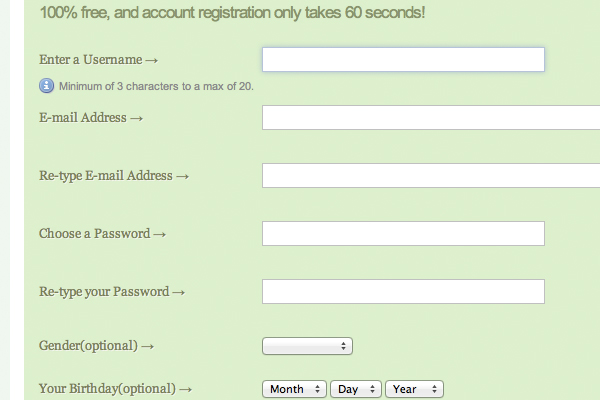 <div id="form-container"> <form id="register" name="register" action="index.html" method="post"> <h3>100% free, and account registration only takes 60 seconds!</h3> <div class="row"> <label for="username">Enter a Username →</label> <input type="text" id="username" name="username" class="reg-input tiny" autocomplete="off" tabindex="1"> <div class="note"><span id="note-username">Minimum of 3 characters to a max of 20.</span></div> </div>