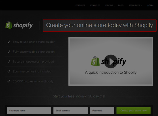 Целевая страница Shopifyотображает хороший пример заглавия сайта. Пользователь сразу же получает краткий обзор того, что за услугу ему готовы предложить. Заглавие на этой странице  разработано с использованием большого шрифта и находится на видном месте так, чтобы сразу же обратить на себя внимание пользователей. А использование ключевой фразы «Интернет-магазин» в заглавии положительно скажется на SEO.