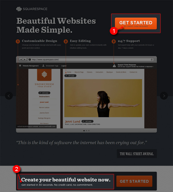 • Предложение бесплатной пробной версии (если возможно). Например, для начала предоставить пользователю возможность использовать на время определенный продукт, а после уже полностью получить доступ к продукту. Если понравится. Squarespace показывает хорошие примеры снижения риска при подписке и использования веб-служб.