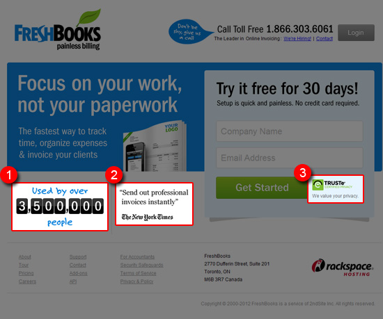 На FreshBooks целевую страницу, можно увидеть три элемента доверия: (1) число людей, использующиесях веб-службы, (2) цитатами из авторитетных и известных сайтов, таких как Нью-Йорк Таймс и (3) конфиденциальность их сертификации.