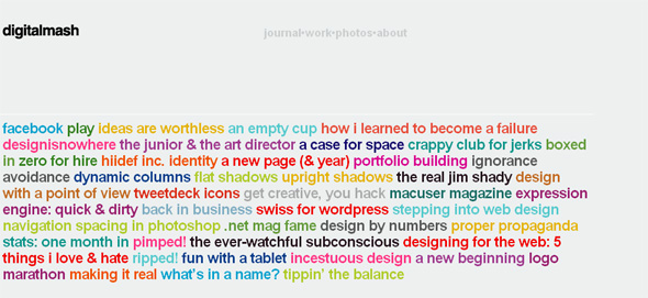 Отчетливо прослеживается тенденция к созданию сайта из слов. По сути интерфейс главной страницы такого сайта — это яркие цвета шрифта, масса слов и линков, которые ведут уже непосредственно к разделам/конкретным статьям/примерам работ (если это портфолио).