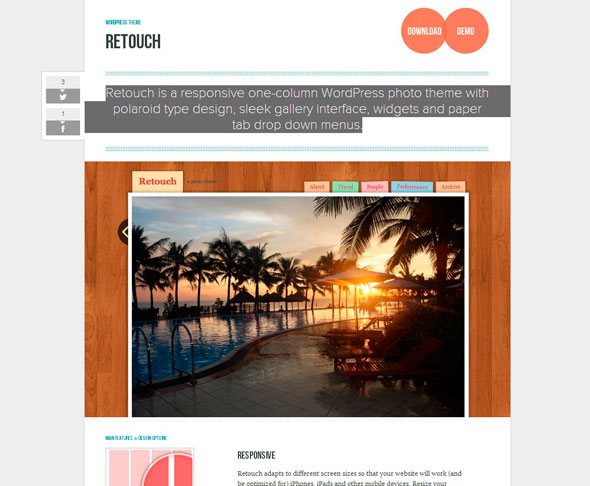 Retouch - одноколоночная фото-тема для WordPress с галереей, виджетами и выпадающим меню в виде закладок.